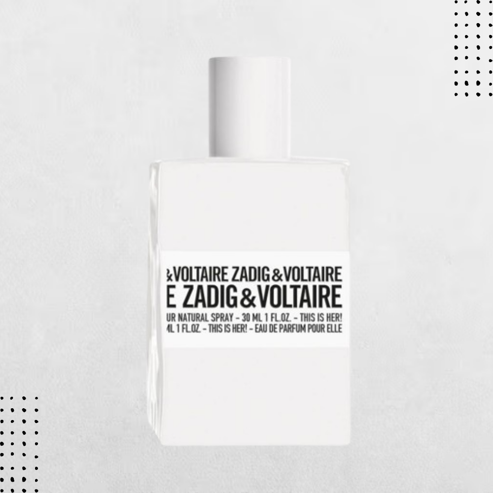 Zadig & Voltaire โ€“ This is Her The fragrance was created to break with market trends and find balance. Cleanliness (Jasmine) and Dark, Mysterious (sandalwood, chestnut) among the notes. This Women's perfume is Irresistible And Unpredictable A woman's scent.